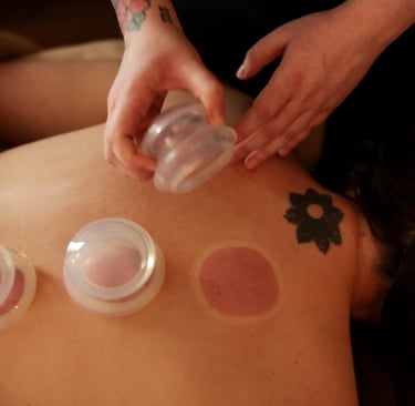 Cupping uses gentle suction to lift and decompress the tissue, improving circulation and releasing tight fascia.