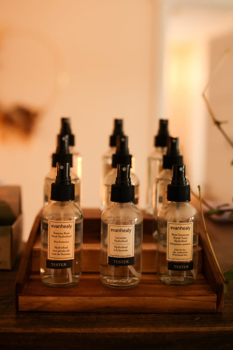 We exclusively use evanhealy, a plant-based skincare line rooted in holistic skin health. Their formulations feature organic botanicals, hydrosols, and nourishing oils that work with the skin rather than disrupting its natural balance.